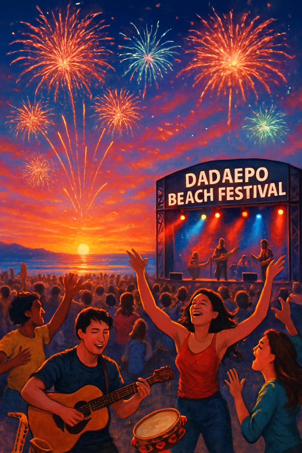 - 다대 불꽃쇼: 석양을 배경으로 한 환상적 불꽃 퍼포먼스! 8월 1일 저녁 7:45, 다대포 해수욕장 일몰 명소에서 대규모 불꽃쇼가 개최됩니다. ‘노을이 머무는 시간(SUNSET HOUR)’ 콘셉트로 진행되며, 물 위 수상 퍼포먼스와 그랜드 피날레 불꽃연출로 축제의 시작을 장식합니다.
